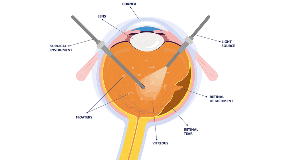 Most patients will require an internal approach that involves a procedure called a vitrectomy. During this procedure, which is usually performed under local anaesthetic as a daycase, tiny instruments are inserted into the vitreous cavity of the eye and the gel is removed before a bubble of gas or a medical oil (silicone oil) is injected to reattach the retina whilst treating the tear in the retina with laser or freezing therapy (cryotherapy).
